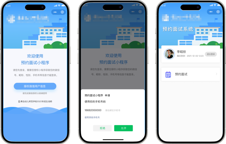 學(xué)校通過網(wǎng)站、微信公眾號(hào)、微信群等方式發(fā)布招生簡章,學(xué)生及家長收到通知后,可掃描二維碼進(jìn)入小程序。小程序自動(dòng)獲取當(dāng)前微信綁定的手機(jī)號(hào)進(jìn)行注冊(cè)和登錄。成功登錄后,進(jìn)入招生面試管理系統(tǒng)小程序的主頁。