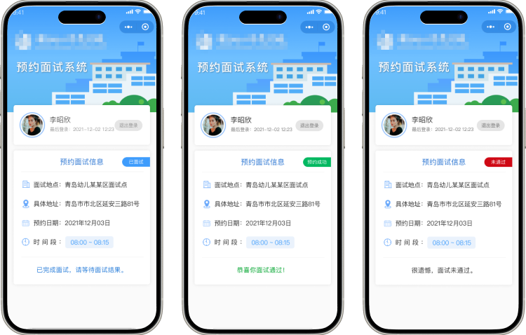 系統(tǒng)在預(yù)約面試日期前三天、前一天、預(yù)約當(dāng)天,以及預(yù)約時(shí)間段的前3小時(shí),分別發(fā)送提醒通知,確保考生按時(shí)到達(dá)面試現(xiàn)場。