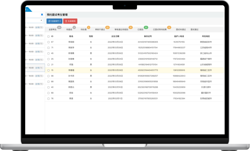 預(yù)約面試系統(tǒng)相比招考管理系統(tǒng),減少了組織筆試相關(guān)的功能模塊(如科目管理、考點(diǎn)管理、考場管理、座位管理、座位安排、筆試成績錄入等),也沒有面試日程表功能。但它增加了考生報(bào)到、查看排隊(duì)情況、以及叫號(hào)大屏幕等功能,專門針對(duì)大規(guī)模人員面試業(yè)務(wù)場景的需求進(jìn)行了優(yōu)化。