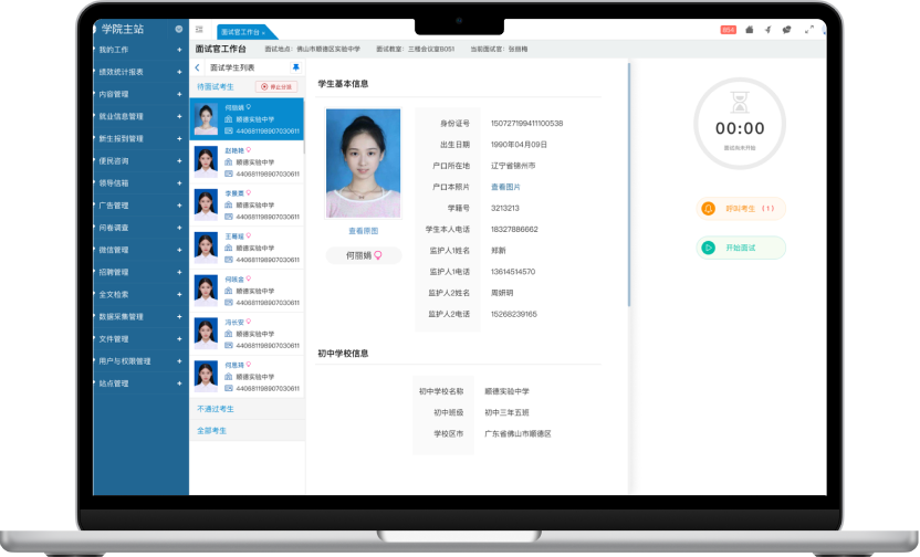 面試官工作臺(tái)支持叫號(hào)、考生未到場處理、開始面試、結(jié)束面試、錄入面試結(jié)果等操作,并提供倒計(jì)時(shí)及超時(shí)提醒功能。