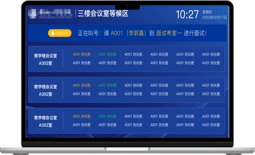 類似醫(yī)院的候診大屏幕設(shè)計(jì),系統(tǒng)設(shè)計(jì)了專門的叫號(hào)大屏幕,實(shí)時(shí)展示并播報(bào)正在叫號(hào)的考生信息,同時(shí)顯示各面試教室中已排隊(duì)考生的序號(hào),方便考生及時(shí)到達(dá)指定面試教室等候面試。