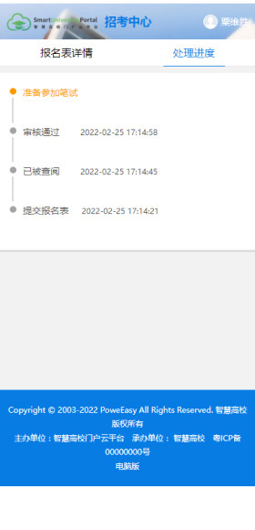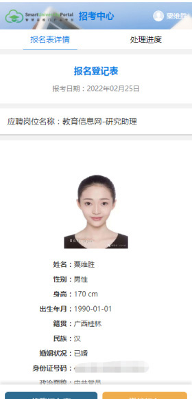 在報名表的上方,通過進(jìn)度條顯示當(dāng)前狀態(tài)、處理過程和結(jié)果,使得應(yīng)聘者(考生)和招聘負(fù)責(zé)人都能一目了然地了解報名表的進(jìn)展情況。
