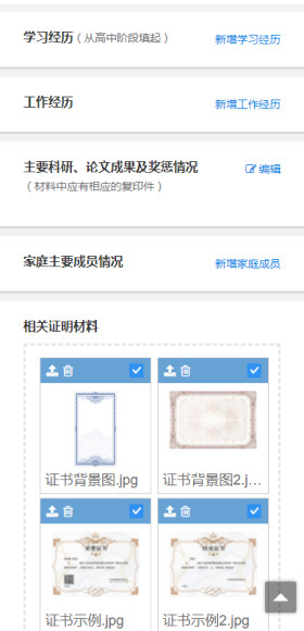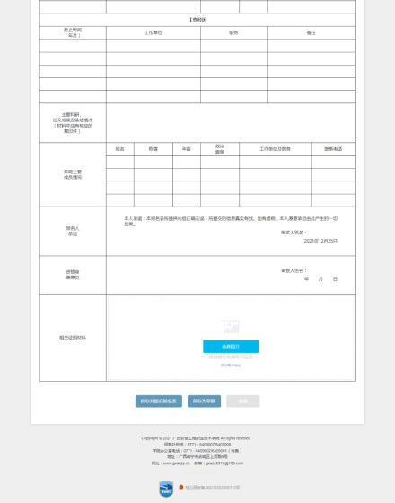 報名表的填寫采用仿真界面,接近紙質(zhì)報名表的樣式,并支持上傳相關(guān)證明材料(圖片、視頻、PDF、壓縮文件等格式)。