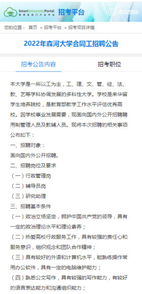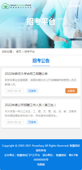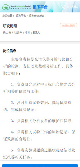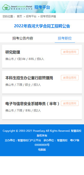 前臺支持顯示招考項目列表,用戶可以點擊項目名稱查看詳細(xì)信息,并在項目詳情頁中查看相關(guān)的招聘崗位列表。點擊崗位名稱后,可查看該崗位的詳細(xì)信息。
