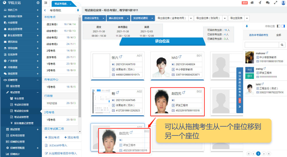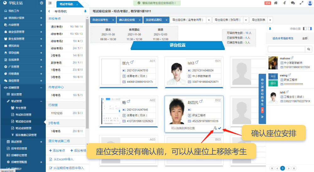 在后臺管理界面中,中欄顯示考點和考場導(dǎo)航信息。右側(cè)展示座位安排表,以所見即所得的方式顯示每個座位的考生信息。同時,右側(cè)還包含“待分派座位的考生”區(qū)域(僅在有待分派考生時顯示)。