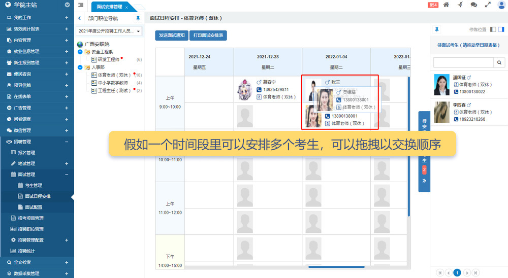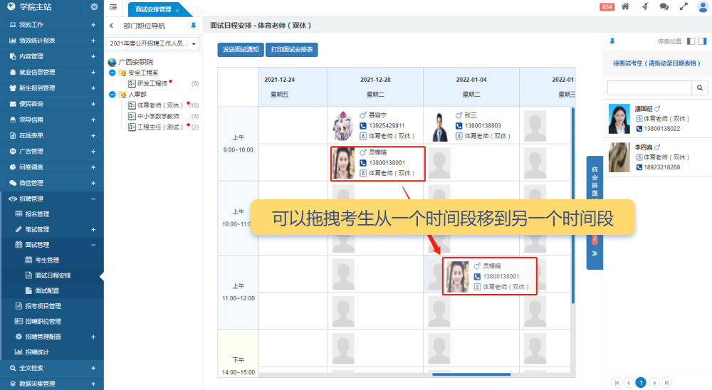 面試日程安排表的列為指定的招聘日期,行為面試時間段,每個單元格顯示該時間段的已安排面試考生及其報考崗位。點擊左側(cè)的招聘崗位,表格將篩選出該崗位已安排面試的考生;點擊右側(cè)的“待安排考生”,表格則篩選出該考生對應(yīng)崗位的已安排考生。用戶可以將“待安排考生”拖拽到未安排面試的時間段,也可以在不同時間段間拖動考生。若一個時間段內(nèi)有多個考生,還可通過拖拽調(diào)整順序。已安排好的考生可隨時移除以重新安排。