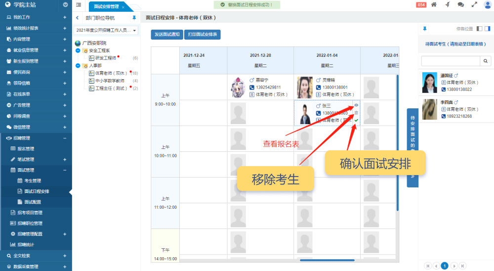系統(tǒng)的中欄顯示本次招考項目的職位列表,每個職位名稱后標(biāo)注進(jìn)入面試流程的考生總數(shù)。若有“待安排面試時間”的考生,系統(tǒng)會以紅點提示。右側(cè)顯示待安排面試的考生列表,中間則為面試日程安排表。