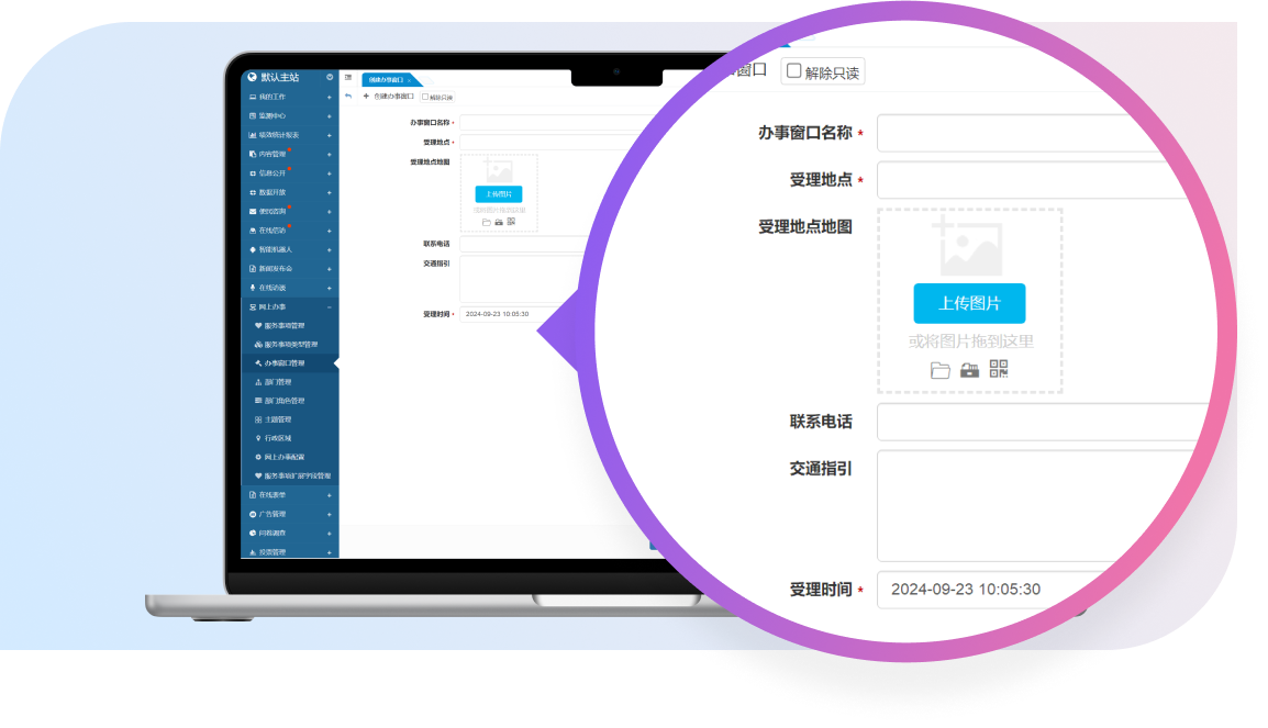 支持創(chuàng)建新辦事窗口、對現(xiàn)有辦事窗口進行修改、查看、刪除、以及搜索與篩選功能,確保管理人員能夠輕松應(yīng)對窗口管理的各項任務(wù)。