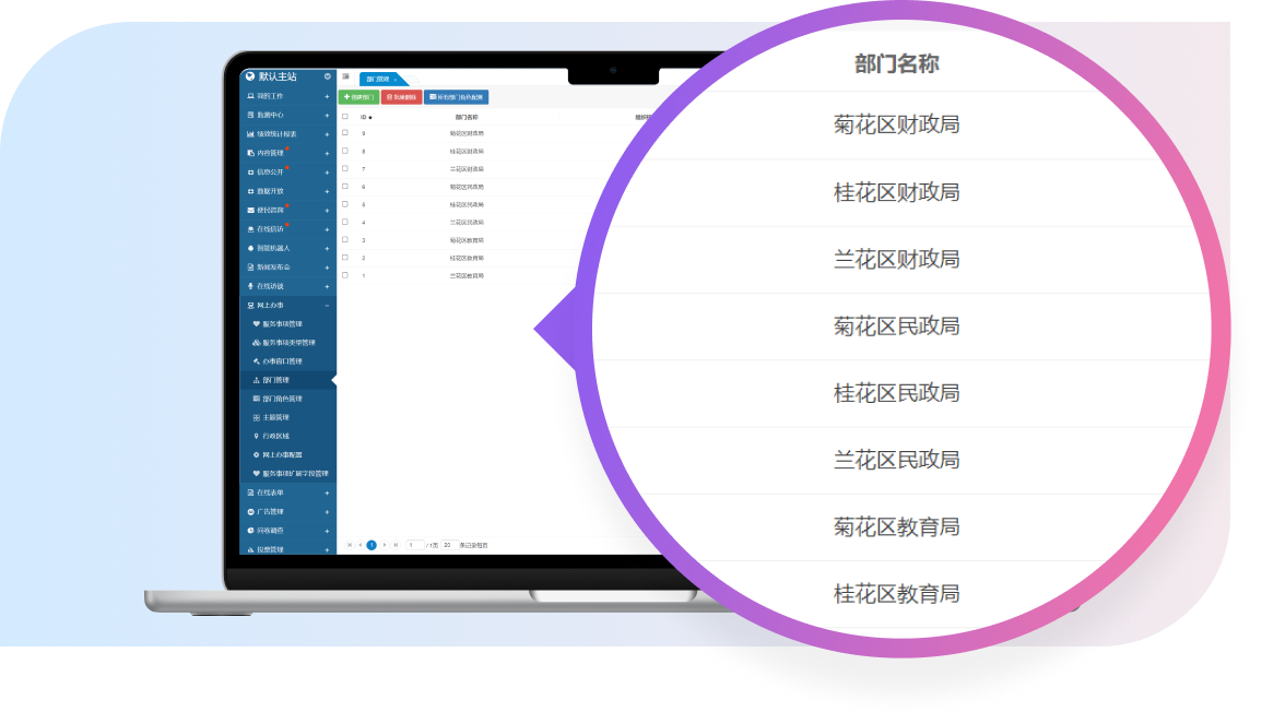 支持按所屬行政區(qū)域進行篩選,管理人員能夠基于地理位置或行政區(qū)劃輕松篩選出相應(yīng)部門,提升了管理的便捷性和精確度。