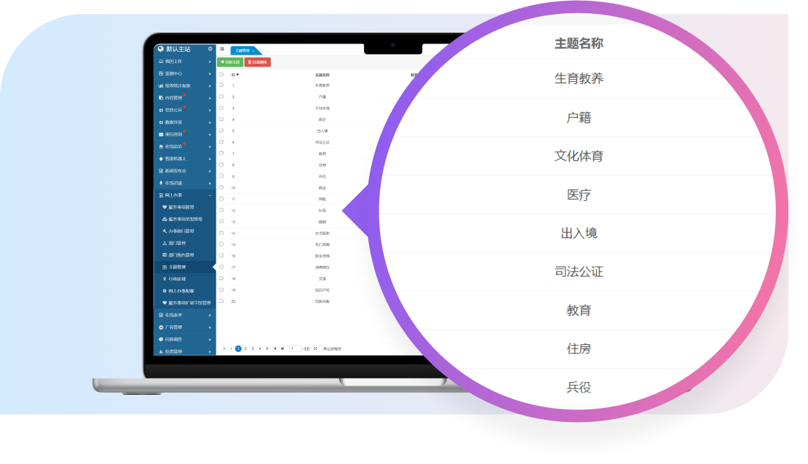 該系統(tǒng)集成了多個核心功能子模塊,包括服務(wù)事項管理、辦事窗口管理、部門管理、主題管理、行政區(qū)域管理等功能子模塊。