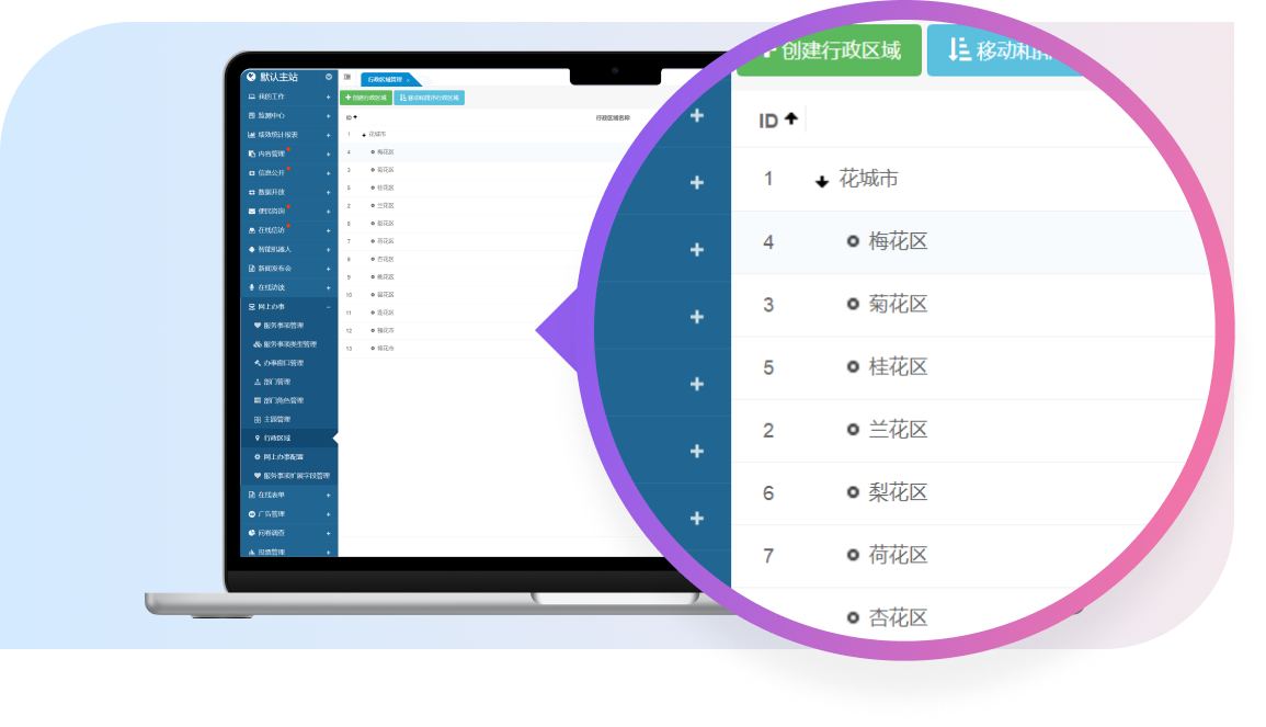 支持創(chuàng)建、修改、查看、刪除行政區(qū)域,還提供了搜索與篩選功能,讓用戶能夠迅速定位到目標行政區(qū)域。