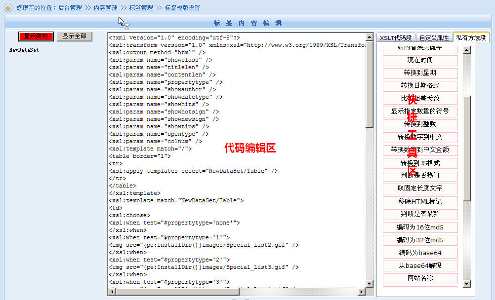 拖拽式編輯界面:和2006一樣,動(dòng)易CMS 2007的標(biāo)簽編輯界面和模板編輯界面是一致的。包括代碼輸入?yún)^(qū)域、快捷工具區(qū)域。只要把需要用到的代碼段、函數(shù)、功能、變量……從快捷工具區(qū)拖到你需要插入的位置,系統(tǒng)就會(huì)自動(dòng)生成對(duì)應(yīng)的代碼。