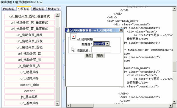 首先,我們進(jìn)入到首頁(yè)模板編輯模式,為模板添加內(nèi)容標(biāo)簽。內(nèi)容標(biāo)簽是用于……。我們將名為“test分頁(yè)”的內(nèi)容標(biāo)簽拖拽到右邊的模板編輯框的相應(yīng)位置。然后系統(tǒng)會(huì)彈出標(biāo)簽編輯器的對(duì)話框,在這個(gè)對(duì)話框里,我們可以設(shè)定內(nèi)容查詢的欄目、專(zhuān)題、選擇分頁(yè),分頁(yè)顯示數(shù),勾選是否主分頁(yè)等,如下圖: