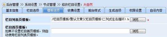 c、“大自然”節(jié)點(diǎn)的模板選項(xiàng)設(shè)置了“欄目列表頁模板”、“欄目首頁模板”及“內(nèi)容頁模板”。