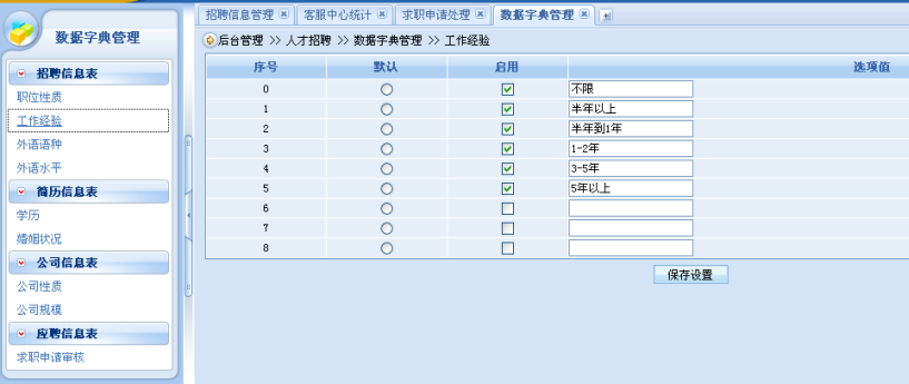 為了用戶可以更好地對(duì)系統(tǒng)進(jìn)行自定義管理,以滿足自己的個(gè)性化需求,系統(tǒng)內(nèi)置了數(shù)據(jù)字典管理功能,用戶可以對(duì)職位類型、工作經(jīng)驗(yàn)、職位狀態(tài)、行業(yè)類別、公司規(guī)模等等字段選項(xiàng)進(jìn)行自定義填寫。