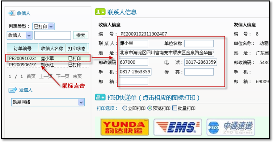 對(duì)于已開始發(fā)貨流程、需打印的訂單,系統(tǒng)可以實(shí)現(xiàn)快速查找,并且只需點(diǎn)擊相應(yīng)的訂單編號(hào)即可實(shí)現(xiàn)收貨人信息的自動(dòng)填寫,無(wú)需手動(dòng)填寫或處理。